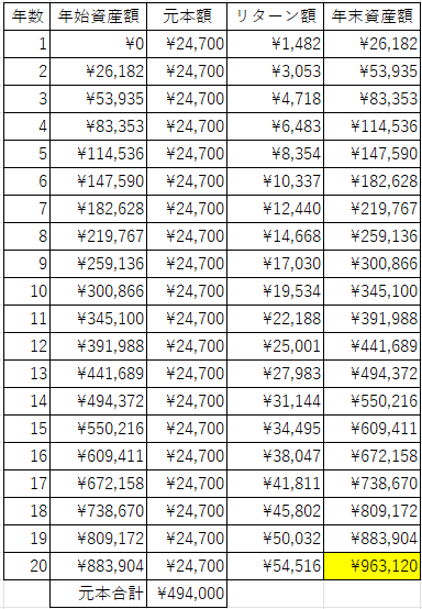 元本494,000円に対して、資産は963,120円と2倍近くに増えています。